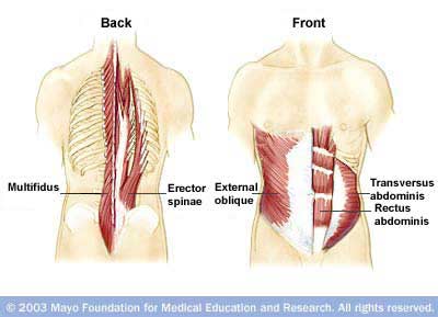 The core , or trunk, of your body is your centre of gravity. Strong core muscles - abdominal, back and pelvis - provide support to your spine for everything from walking, lifting and standing to sitting. Weak core muscles may lead to poor posture, lower back pain and injury.